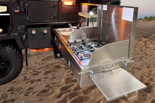 • Slide-out Stainless Steel Kitchen with Sink and 4 burner Gas Stove